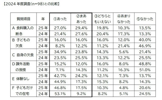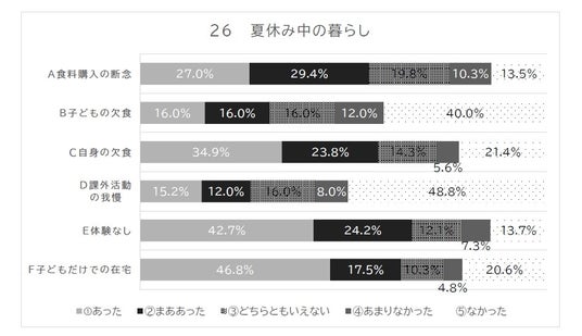 「まあ」を含めると、回答者の6割近くが「A お米や食料を買えないことがあった」といいます。また、およそ三人の一人の「子ども」が、「親」にいたっては二人に一人以上が「欠食」の経験を持っておられます。しかも、いずれも昨年より値は高くなっています。