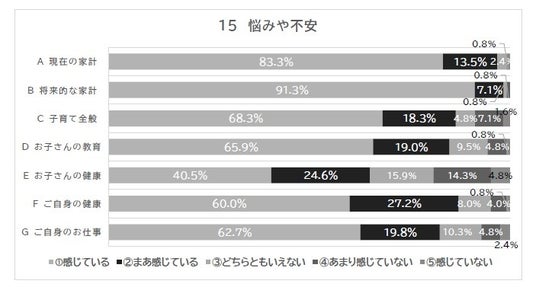「家計」については現在であれ将来であれ、ほぼ全員が「まあ」を含め、悩みや不安を感じています。「子どもの健康」が最も低いですが、それでも約65%にもなっています。