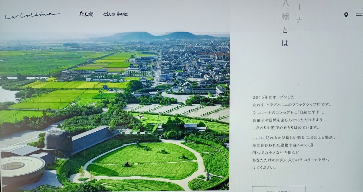 2015年に老舗和菓子会社の旗艦店として完成。琵琶湖の東岸・近江地域の観光拠点になっている。草屋根で覆われた建物が特徴で、中庭に広がる水田には稲が育ち、焼きたてのバウムクーヘンの香りが土壁の路地まで広がっていた。