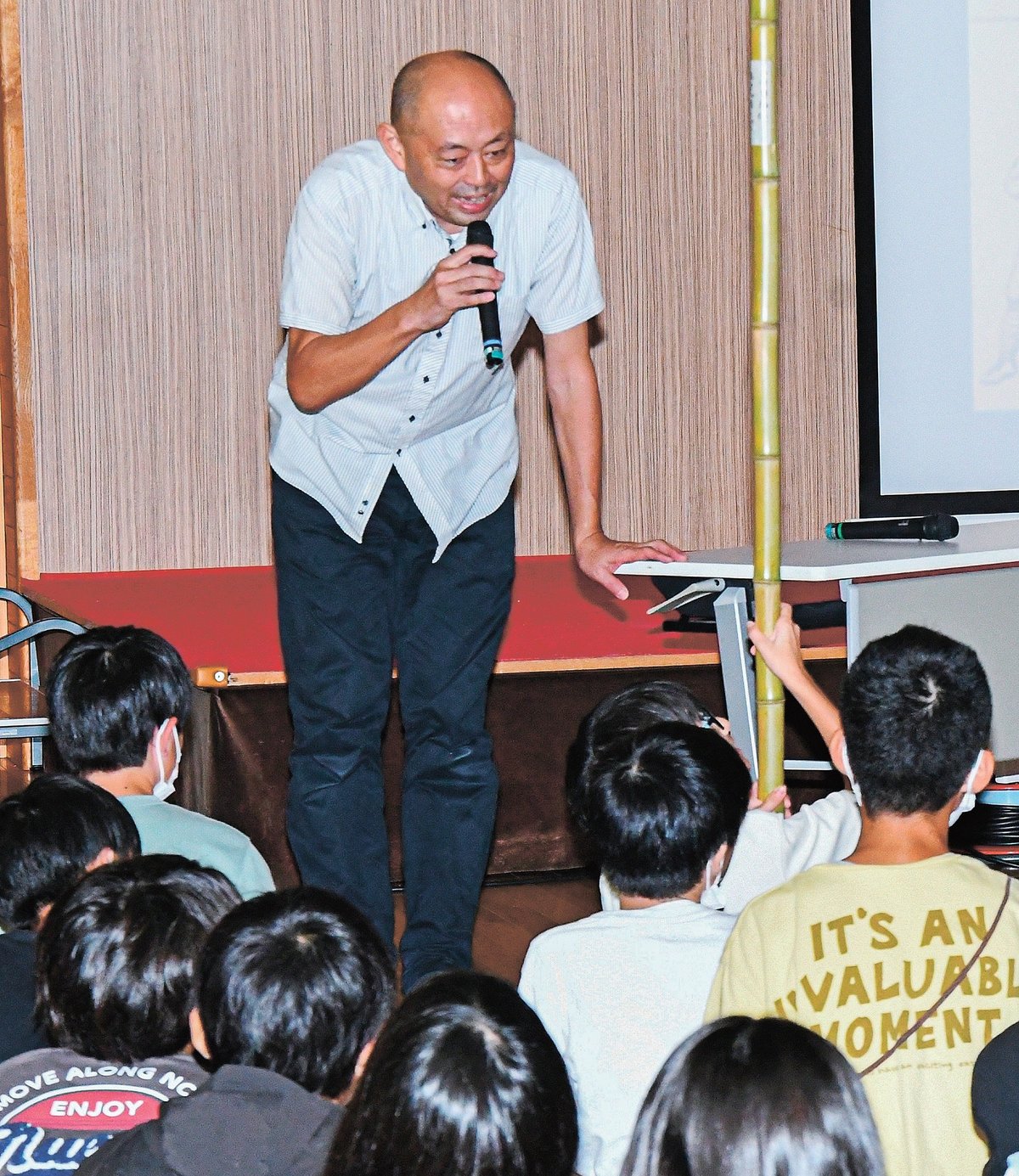 当時の小学生の様子も紹介し、竹やりの見本を示しながら「先生が一人でも多くの敵兵を竹やりで殺すように指導した。戦争で一番恐ろしいのは人の心が壊されて何も感じなくなること」と強調した。