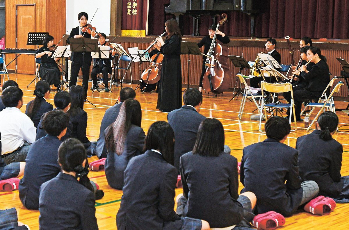 バイオリン、クラリネット、オーボエなどを専門とする11人の団員が来校。バッハの「オーボエとバイオリンのための協奏曲」やベートーベンの「七重奏曲」、サンサーンスの「動物の謝肉祭」などを演奏した。生徒たちは高い演奏技術から生み出される重厚な音色に耳を傾け、曲が終わるごとに大きな拍手を送った。