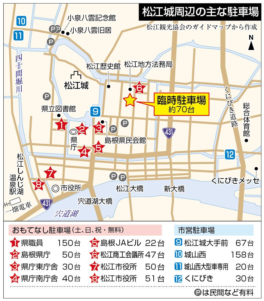 松江城周辺は市営松江城大手前駐車場のほかに小泉八雲記念館に近い市営城山西駐車場(有料、同158台)や民間が運営する駐車場がある。土日祝日のみ無料開放する「おもてなし駐車場」は、県職員駐車場(同150台)、松江商工会議所駐車場(同47台)など計8カ所で計440台を用意している。