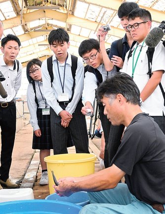 日野郡の課題解決を探るカリキュラム「日野探究」の一環で見学した。訪れた2年生5人は、日野川の豊かな幸を名物商品にしたいとのテーマに取り組んでいる。今回、日吉津村や地元企業などが出資するひえづ村づくり公社が特産品としてブランド化を進める「夏香鮎」を養殖する生産場を見学し、商品開発のヒントを探った。
