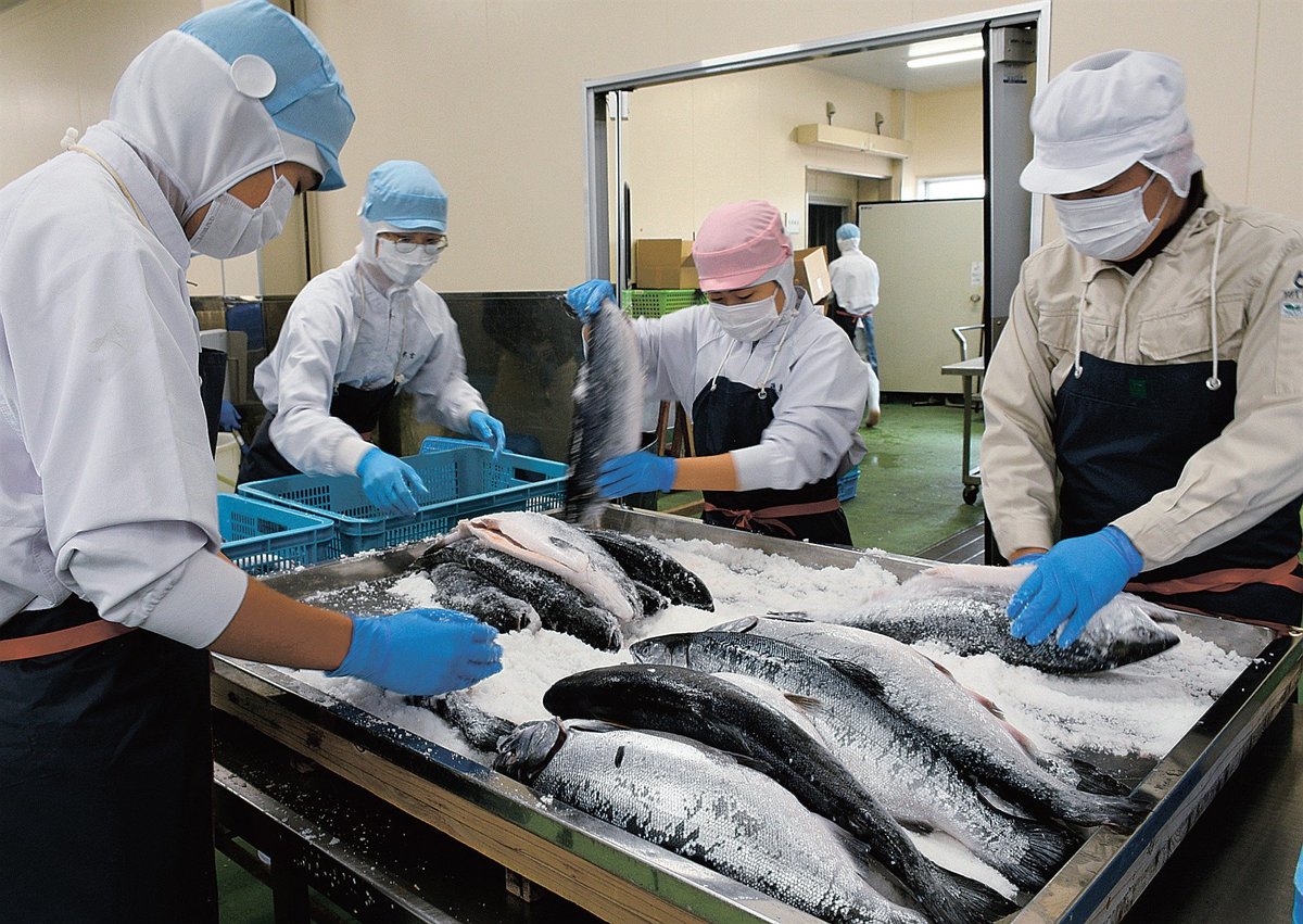 この日は作業の最終日で約300匹を加工した。えらや内臓を取り除いた重さ平均1・6キロ、全長55センチ前後のサケのぬめりや水分を取り除き、1匹当たりに約30グラムの塩をすり込んだ。