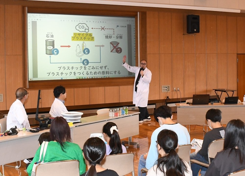 「ごみ」ではなく「資源」として、家庭から出るプラスチックの分別収集を始めた同町の啓発イベント。廃プラスチックを新たな製品の原料として循環させる「マテリアルリサイクル」に取り組む三井化学(東京)の担当者が先生役を務めた。