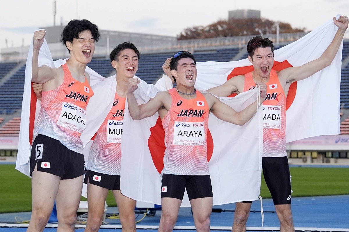 東京デフリンピック第10日は24日、駒沢陸上競技場などで行われ、陸上男子1600メートルリレー決勝で、足立祥史(松江ろう学校教諭)が1走を務めた日本が3分17秒00で金メダルを獲得した。