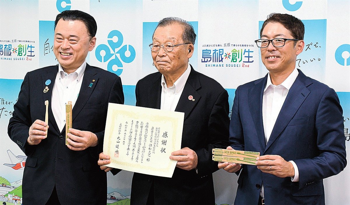 【松江】防災備蓄品として竹歯ブラシを寄贈したとして、NPO法人全国災害復興活動支援機構島根歯ブラシバンクに島根県の丸山達也知事がこのほど、感謝状を贈った。