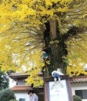 イチョウはすっと空へ伸びた樹形が印象的で、推定樹齢は100年。幹回り2・7メートル、樹高約20メートル。20日ごろに色づき始めた。特別な手入れや施肥などはしていないのに、この秋は例年より見事な黄金色に染まった。