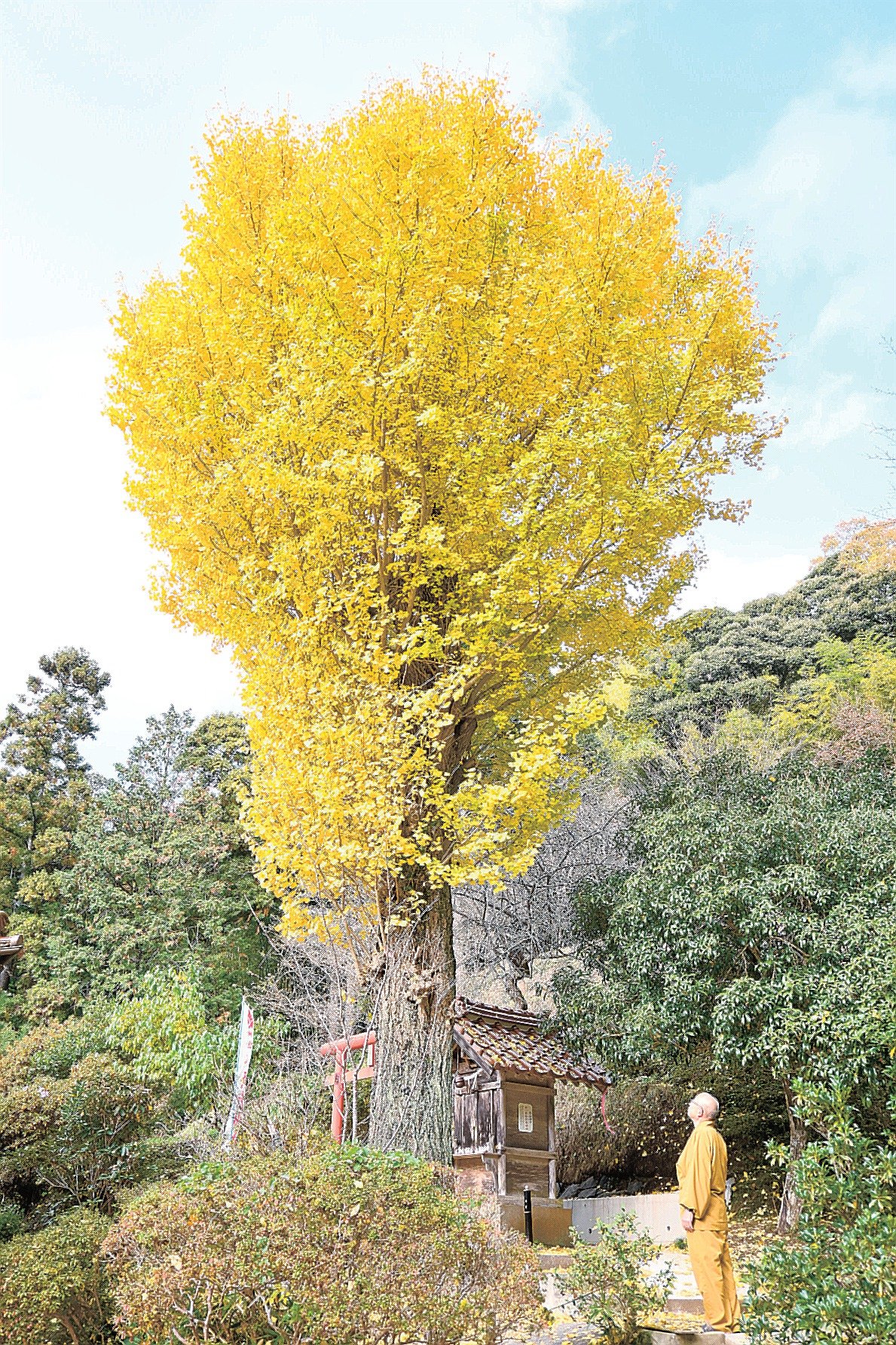 イチョウの足元にはお宮(正一稲荷大明神)があり、藤林住職は台風対策で枝を落として小ぶりにする予定だったというが「あんまりきれいで、迷ってしまう」と目を細めた。(今井菜月)