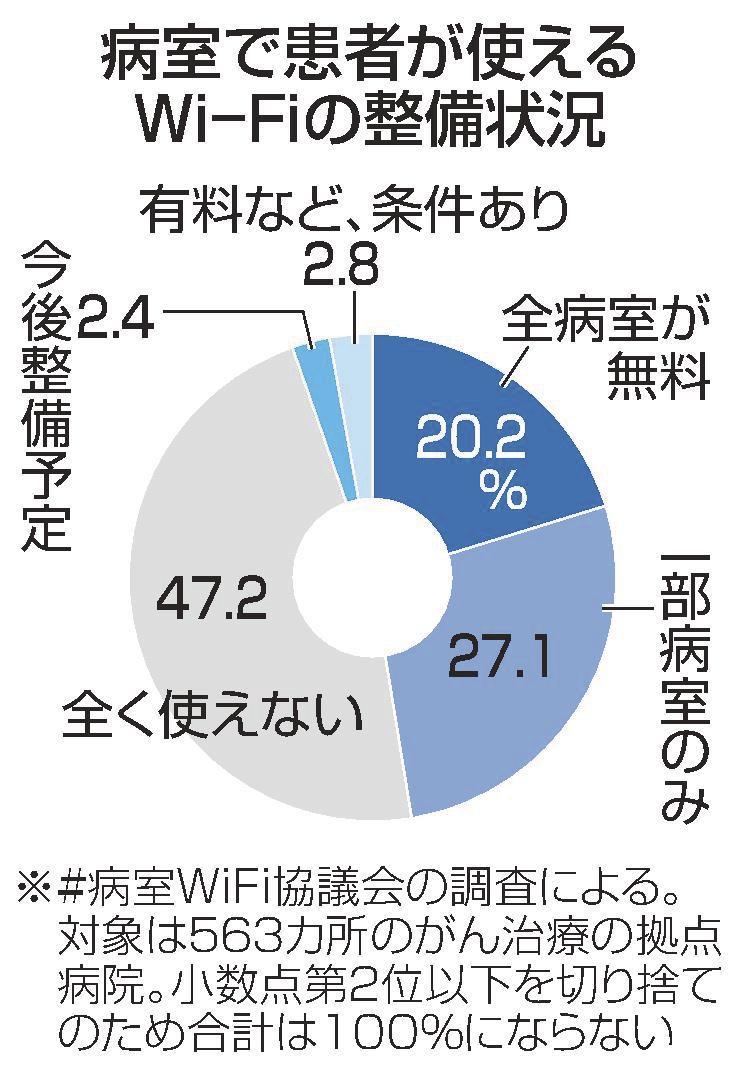 全国563カ所にあるがん治療の拠点病院などのうち、大部屋を含む全病室でWi-Fiが無料で利用できるのは約20%にとどまることが6日、がん経験者らでつくる「#病室WiFi協議会」の調査で判明した。患者が医療機関を選ぶ際の参考にしてもらおうと実施し、厚生労働省で記者会見して結果を公表した。