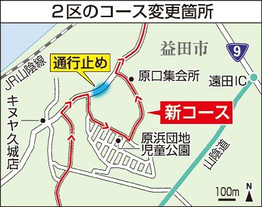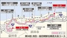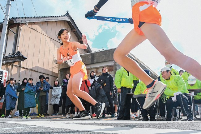 一般男子区間では最短。中継所を出ると道幅の狭い緩やかな上り坂を2キロほど走り、国道9号へ。合流してからも上り坂が続き、さらに残り1キロ付近からは下り坂。走りに工夫が求められる。