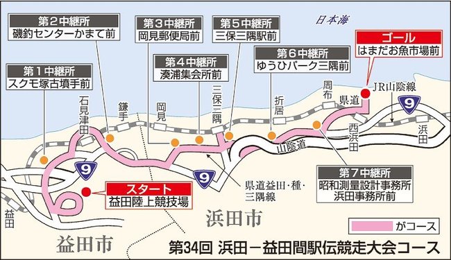 第34回浜田-益田間駅伝競走大会(愛称・しおかぜ駅伝=浜田市、益田市、島根陸上競技協会、山陰中央新報社主催、TSKさんいん中央テレビ特別後援、ジュンテンドー特別協賛、山陰合同銀行、中国電力ネットワーク、JAグループ島根、イワタニ山陰協賛)が14日、師走の石見路を駆け抜けるコースで行われる。今大会は34チームが出場。益田陸上競技場をスタートし、はまだお魚市場前でゴールする8区間40・1キロの舞台を紹介する。