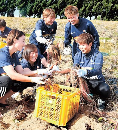 2時間をかけて約1トンを収穫し、終了後は焼き芋を全員で味わった。参加したMFの岩下綺良々選手(24)は「地域に密着した活動ができてうれしい。スイートポテトにして食べてみたい」と喜んだ。農園の鎌田勉代表(74)は「今季は大健闘の1年だった」と選手たちをたたえ「おいしい芋を食べて疲れを癒やしてほしい」と話した。