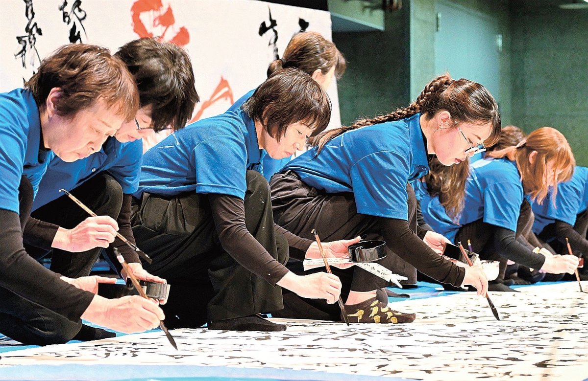 書道パフォーマンスでは子どもから大人まで曲のリズムに合わせて力強く揮毫(きごう)した。浜田高校書道部は筆を走らせる動作を盛大な舞と捉え、創作熟語「瞬舞(しゅんぶ)」をしたためた。五風会員は中国の書作品「蘭亭序」を手分けして丹念に書き上げた。