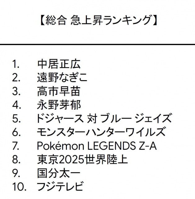 今年のトレンドを映す「総合 急上昇ランキング」では、1位が中居正広。このほか1位は、「映画」は『「鬼滅の刃」無限城編 第一章 猗窩座再来』。「歌詞」は米津玄師『チェンソーマン レゼ篇』主題歌「IRIS OUT」。「ドラマ」は『私の夫と結婚して』となった。
