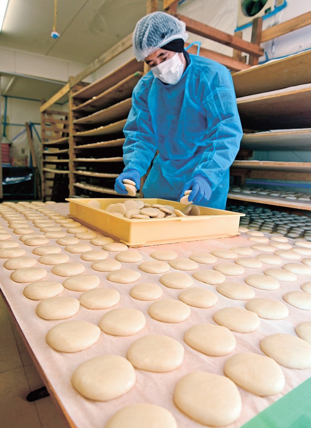 今年の作業は1日から始まった。この日はスタッフが乾燥させた餅を棚から下ろし、箱に入れて、検品、袋詰めする作業に追われた。30年前から平餅作りに携わる田辺チカ子さん(78)は「多くの人に、よくのびる餅を味わってほしい」とほほ笑んだ。(中山竜一)