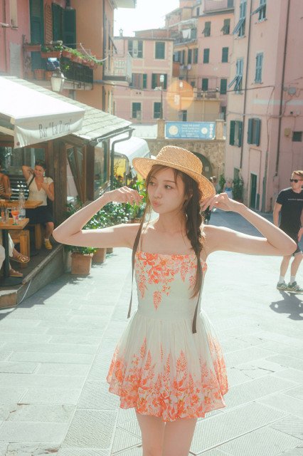 今回公開されたのは、鮮やかなオレンジのワンピをまとった街ブラショット。イタリアの世界遺産の村・チンクエテッレの街を鮮やかなオレンジの花柄ワンピに麦わら帽で歩く。細い坂道に所狭しとショップやレストランが並ぶローカルな街並みを、興味津々で散策した。
