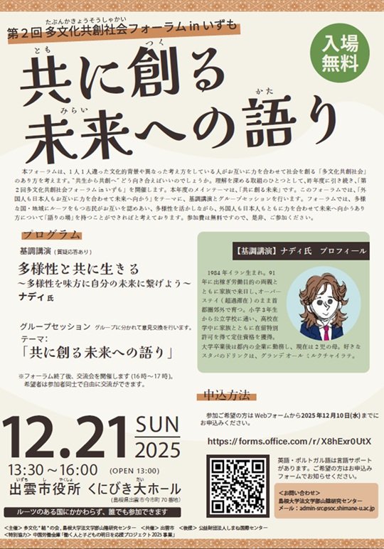 多文化共創社会フォーラム「共に創る未来への語り」が21日午後1時半から、出雲市今市町の市役所くにびき大ホールであり、講演やグループセッションを通して、日本人と外国人が互いに力を合わせて生きる社会に向け必要なことを考える。参加無料。