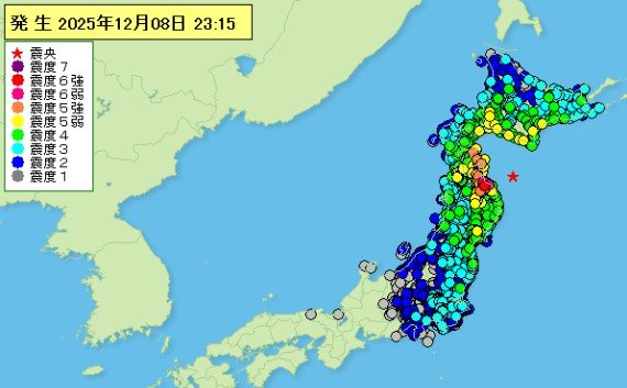 気象庁によると、8日午後11時15分ごろ、青森県三八上北で震度6強の地震があった。地震の規模はマグニチュード(M)7・2から7・6に修正した。