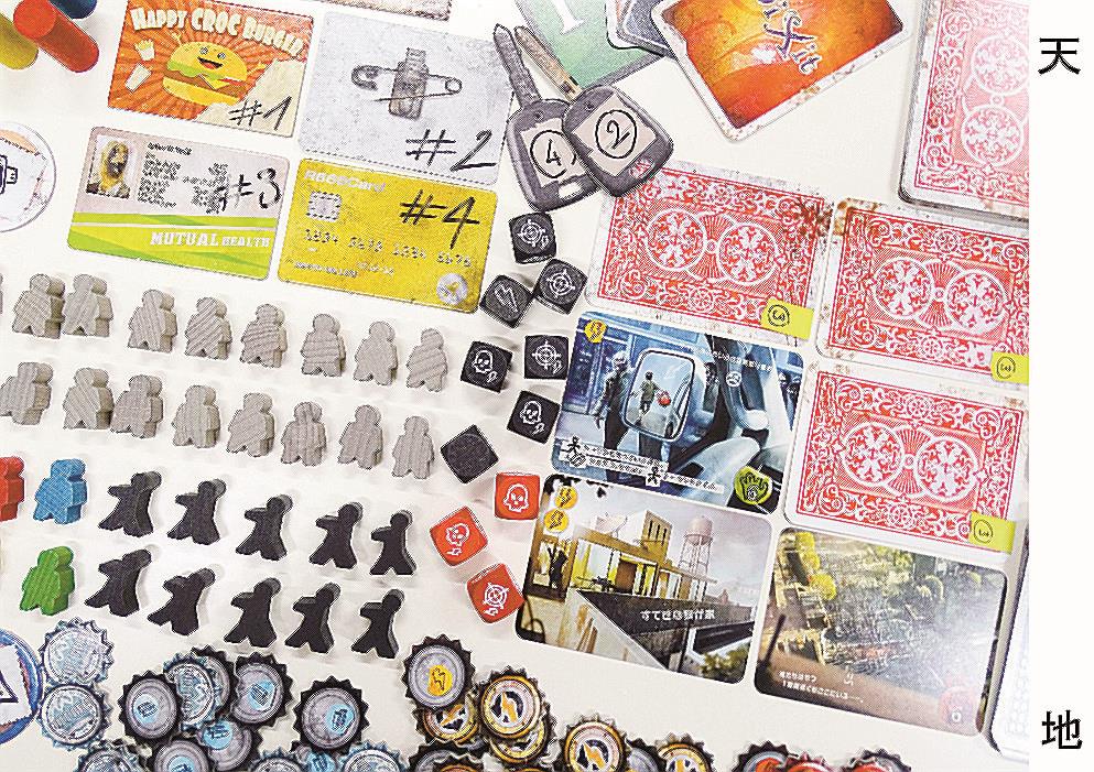 箱やコマ、カードなどは「手元にあった物を流用して作った感じ」にデザインされている。瓶の王冠、汚れたトランプ、使えないクレジットカード、車の鍵…。こうした工夫がプレーを一層盛り上げてくれる。