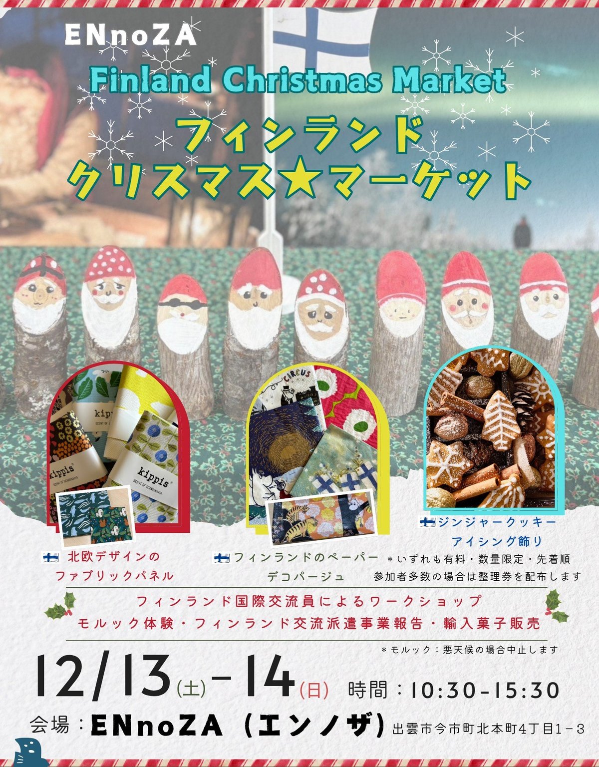 昨年好評だった出雲フィンランド協会によるクリスマスイベントです。出雲市国際交流員のミラさんによる北欧風ファブリックを使ったパネル作り体験、ジンジャークッキーのアイシング飾り、モルック体験など盛りだくさんの内容でご来場をお待ちしております。