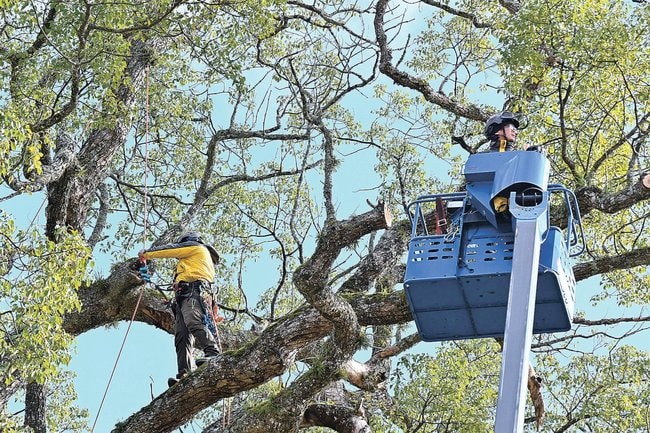 33メートルの高さを誇り、島根県天然記念物に指定されている島根県津和野町池村の「大元神社跡の樟(クスノキ)」の枯れ枝を伐採する作業が12日、始まった。専門家らがロープを使って登り、チェーンソーで枝打ちして手入れを進めた。