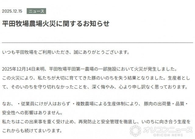 「2025年12月14日未明、平田牧場平田第一農場の一部施設において火災が発生しました。この火災により、私たちが大切に育ててきた豚のいのちを失う結果となりました。生産者として、そのいのちを守り切れなかったことを、深く悔やみ、心より申し訳なく思っております」と報告。