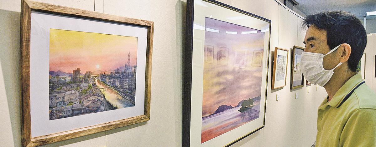 【松江】山陰中央新報文化センター松江教室(松江市殿町)の水彩画講座の講師・水野博司さん(76)=松江市春日町=と水彩画家の小村勝さん(78)=松江市浜乃木4丁目=の水彩画2人展が、中国電力ふれあいホール(松江市東朝日町)で開かれており、風景画を中心とした作品36点が展示されている。入場無料で12日まで。