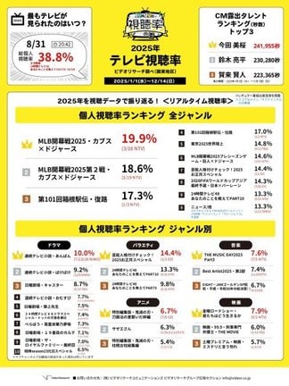 ビデオリサーチは16日、2025年のテレビ視聴率ランキングの速報値を発表。個人視聴率ランキング1位は『MLB開幕戦2025・カブス×ドジャース』(3月18日、日本テレビ)の19・9%だった。見逃し配信の1位は『じゃあ、あんたが作ってみろよ』(TBS)で、522万420回だった。