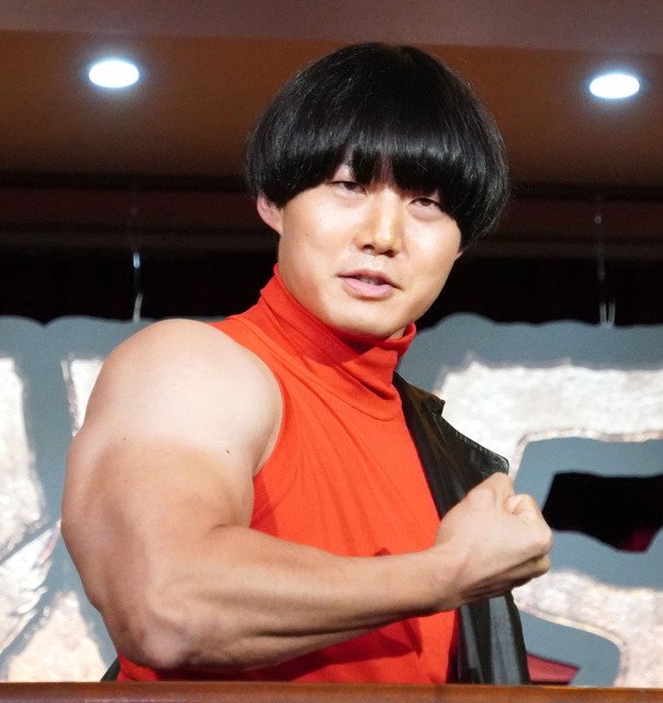 赤いタートルネック(ノースリーブ)に黒のレザージャケットを羽織ったスタイルで登場。ジャケットを脱ぐと、筋骨隆々の二の腕も披露した。