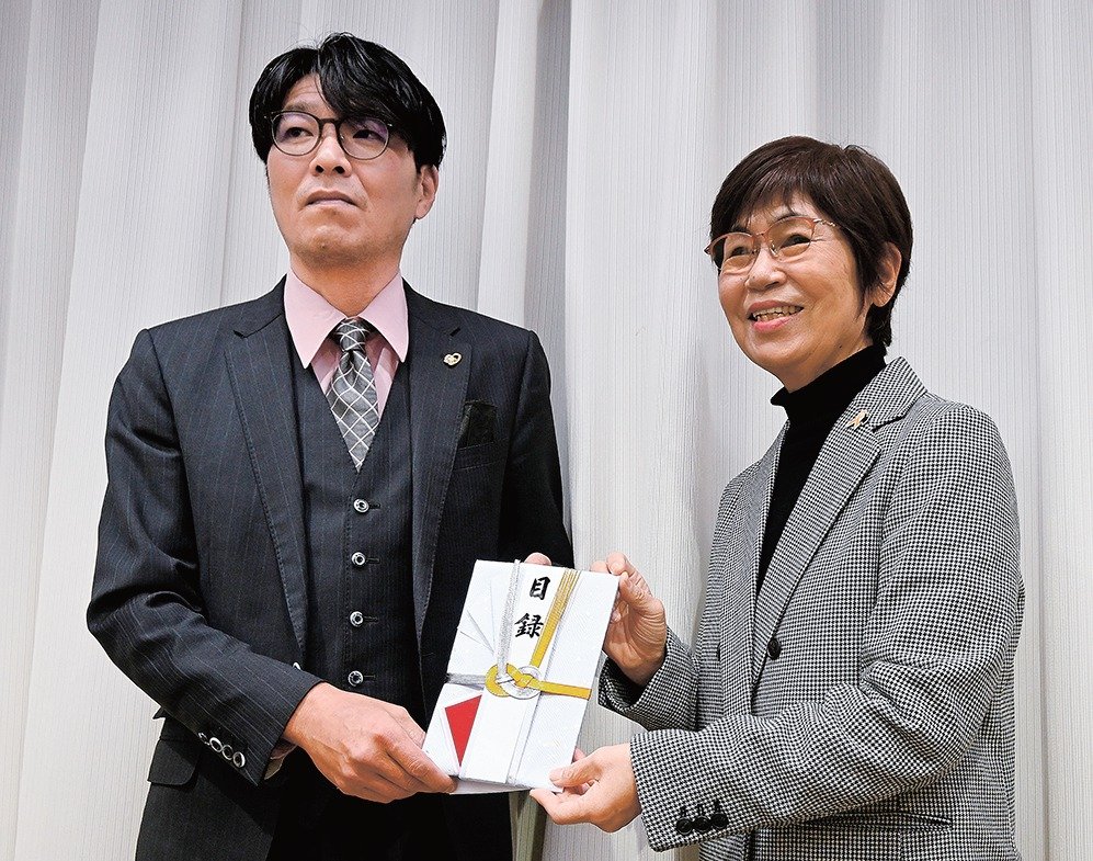 浜田市役所で、千部優能(ひろよし)会長(47)が聖喤寮の三上妙光施設長(70)に目録を手渡し「子どもたちに良い暮らしをしてほしい」と願った。