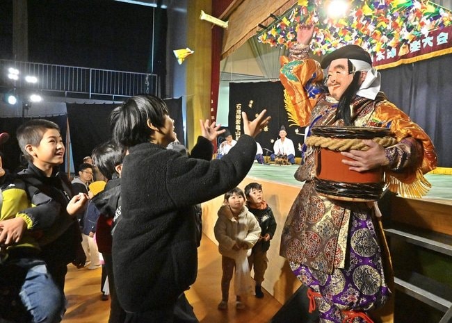 小国神楽社中の恵比須では、舞台前に出てきた子どもたちに恵比須がお菓子を振る舞った。タイのかぶり物をした子どもを抱っこし会場を笑顔にした。