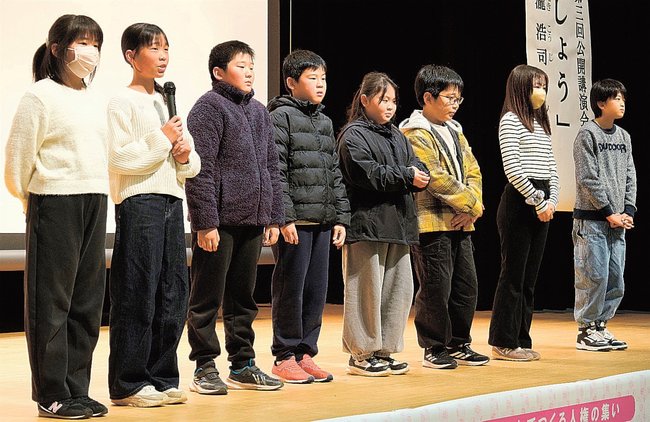 上映後の舞台あいさつで児童、生徒は「うまく演技ができて良かった」「仲間との友情や物語の面白さを学んだ」と振り返った。