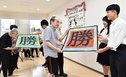 だるまやかぶと、馬、鶴などを折り、「謹賀新年」と書かれたB1サイズの模造紙に貼っていった。出来上がった模造紙はそれぞれの施設に贈った。
