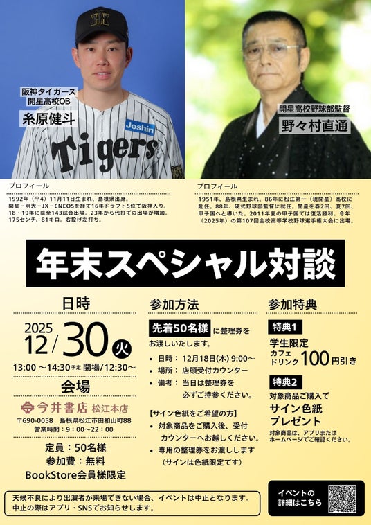 山陰地域を中心に書店事業を展開する株式会社今井書店(本社:島根県松江市殿町、代表取締役社長 舟木徹、以下「当社」)は、2025年12月30日(火)、今井書店松江本店にて、阪神タイガース糸原健斗選手(開星高校OB)と、開星高校野球部監督・野々村直通監督による「年末スペシャル対談」を開催いたします。本イベントは、島根ゆかりのお二人を迎え、野球を通じた挑戦や指導論、島根の野球文化などを語っていただく特別対談です。