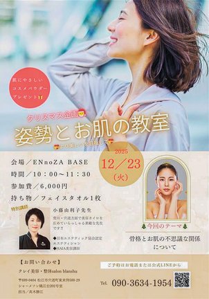クレイ美容・整体の小藤由利子さんによる体験教室です。「骨格とお肌の不思議な関係について」がテーマです。参加費6千円で、肌に優しいコスメパウダーをプレゼント。申し込みは電話090(3634)1954。