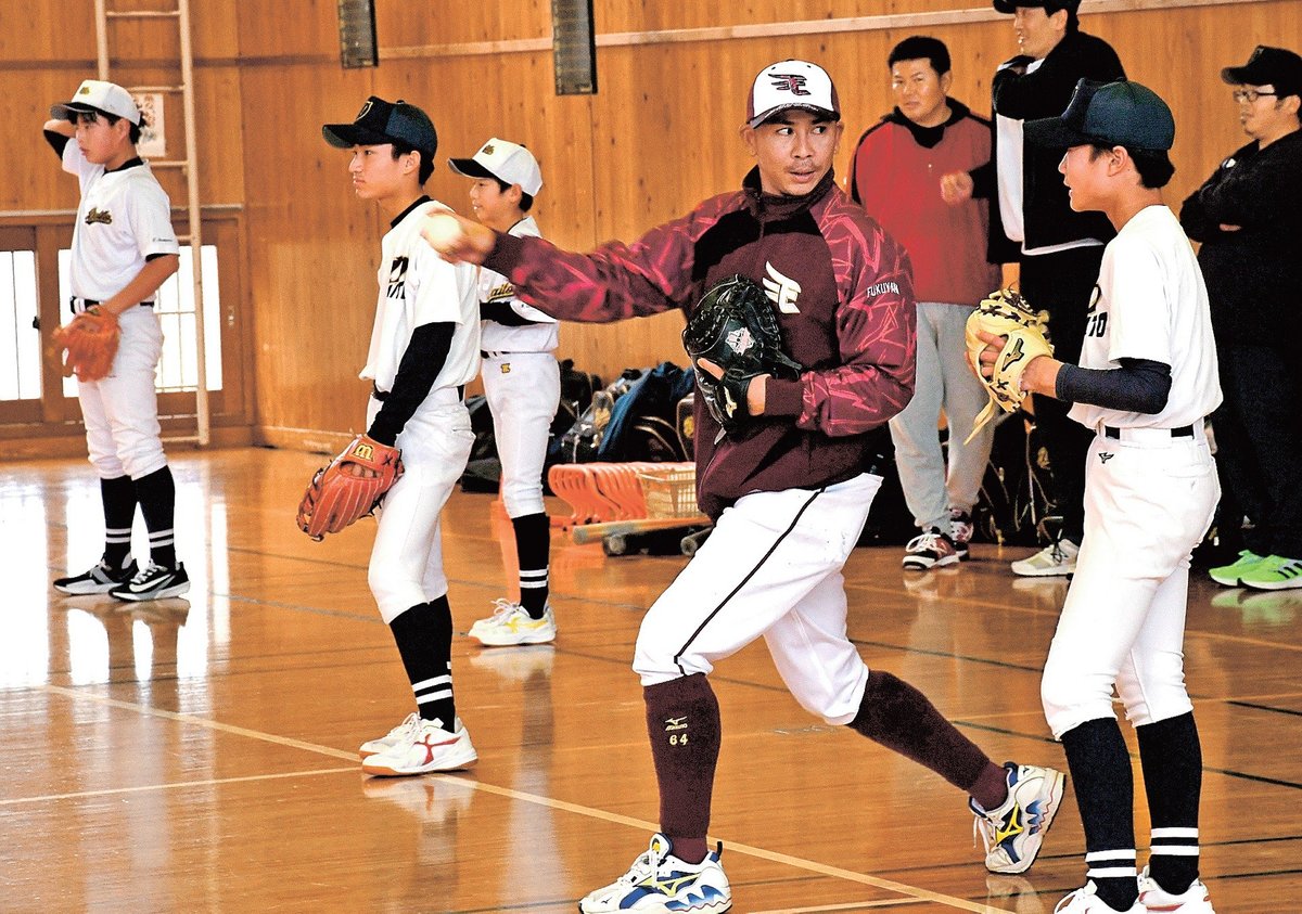 元プロ野球東北楽天ゴールデンイーグルスの福山博之さん(36)=大東高校出身=を講師に招いた野球教室が21日、大東中学校(雲南市大東町養賀)などであった。市内の小中学生約90人が、プロで活躍した選手から送球や打撃の基礎を学んだ。