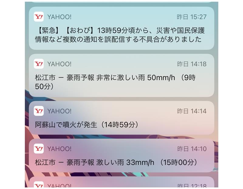 ヤフーは9日、同社が運営するニュースや検索のアプリ「Yahoo!JAPAN」で「阿蘇山で噴火が発生(14時59分)」との災害情報を誤って、プッシュ通知で配信したと発表した。人為的なミスで、配信システムのテスト用の情報を利用者に配信したという。