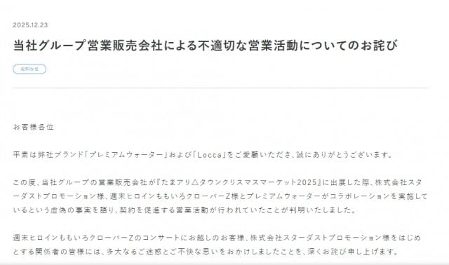 同社公式サイトに「当社グループ営業販売会社による不適切な営業活動についてのお詫び」を掲出。「この度、当社グループの営業販売会社が『たまアリ△タウンクリスマスマーケット2025』に出展した際、株式会社スターダストプロモーション様、週末ヒロインももいろクローバーZ様とプレミアムウォーターがコラボレーションを実施しているという虚偽の事実を語り、契約を促進する営業活動が行われていたことが判明いたしました」と明らかにした。