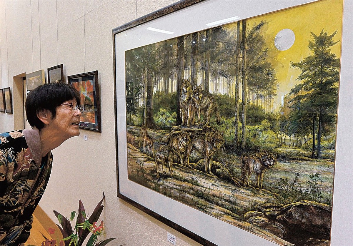 個展のタイトルにもなっている作品「新たに向かう視線」は、森の中に7匹のオオカミがたたずむ。遊んでいたり、悩んで後ろを振り向いていたりするオオカミは、今のすやまさん自身を表現したという。