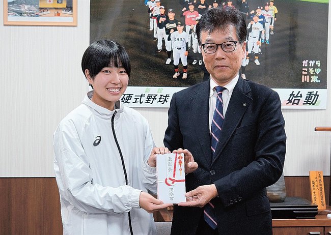 西川さんは「お世話になった方々への感謝の気持ちを持って一生懸命プレーする」と決意表明した。野坂町長は「メンバーに選ばれたのは努力のたまものであり、町の誇りだ。練習の成果を存分に発揮してほしい」と述べ、激励金を贈った。