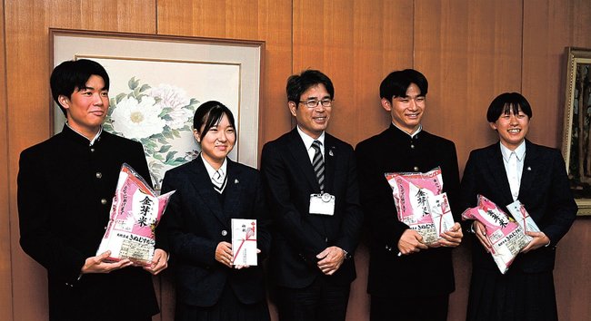 【安来】2026年の全国大会に出場する安来高校男女バレーボール部と男女フェンシング部の主将にJAしまねやすぎ地区本部(安来市飯島町)がこのほど、地元産の金芽米15キロと2万円分の商品券を贈った。