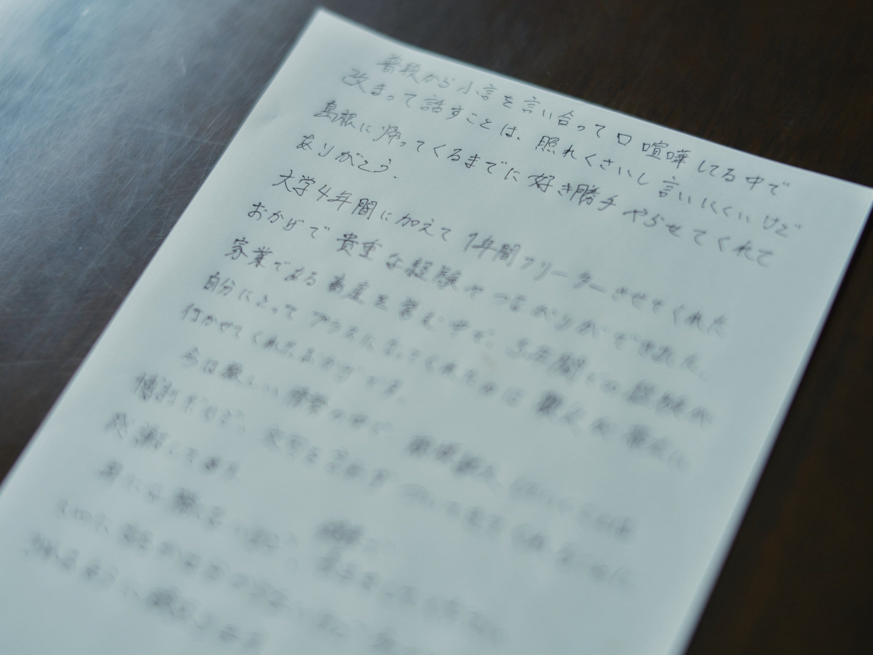 普段から小言を言い合って、口げんかをする中で、改まって話すことは照れくさいし、言いにくいけど、島根に帰ってくるまで好き勝手やらせてくれてありがとう。
