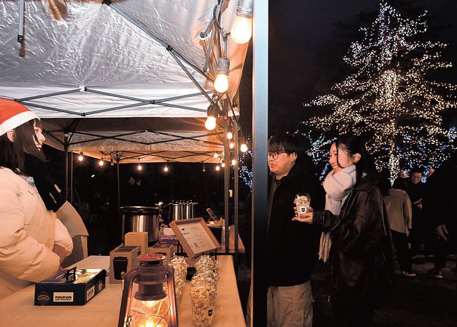 公園の杉の木などにイルミネーションが飾られる時期に合わせて、にぎわい創出を図ろうと市議の西田一平さん(38)が中心になって初めて企画。呼びかけに応じた浜田、大田両市と島根県邑南町にある五つの飲食店がブースを構えた。会場はJR浜田駅から徒歩圏内にあり、歩いて訪れる来場者も目立った。