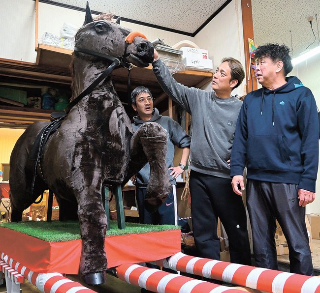来年の干支である「午(うま)」をかたどり、高さ2・1メートル、横80センチ、奥行き2・5メートル。11月から古浦天神会のメンバーが、針金などで作った骨組みに新聞を張り重ねて制作した。