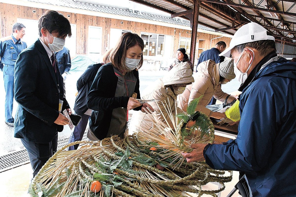 近くの中川巌夫さん(79)は夫婦で1週間前から用意したしめ縄を出品した。もち米のわらを使って独特の間隔で編んだしめ縄は、大中小の各サイズとも飛ぶように売れた。中川さんは「昨年より売れた。寒い中、大勢の人に来てもらい、ありがたい」と感謝した。