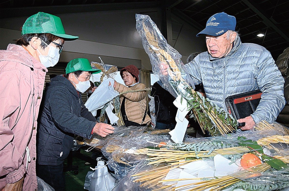 約30人が列を作り、午前9時の開店と同時にお目当てのコーナーに小走りで向かった。人気のしめ縄はサイズや形状によって価格が異なり、主力商品は600~1300円ほどで販売。来場者は品定めしながら買い求めた。