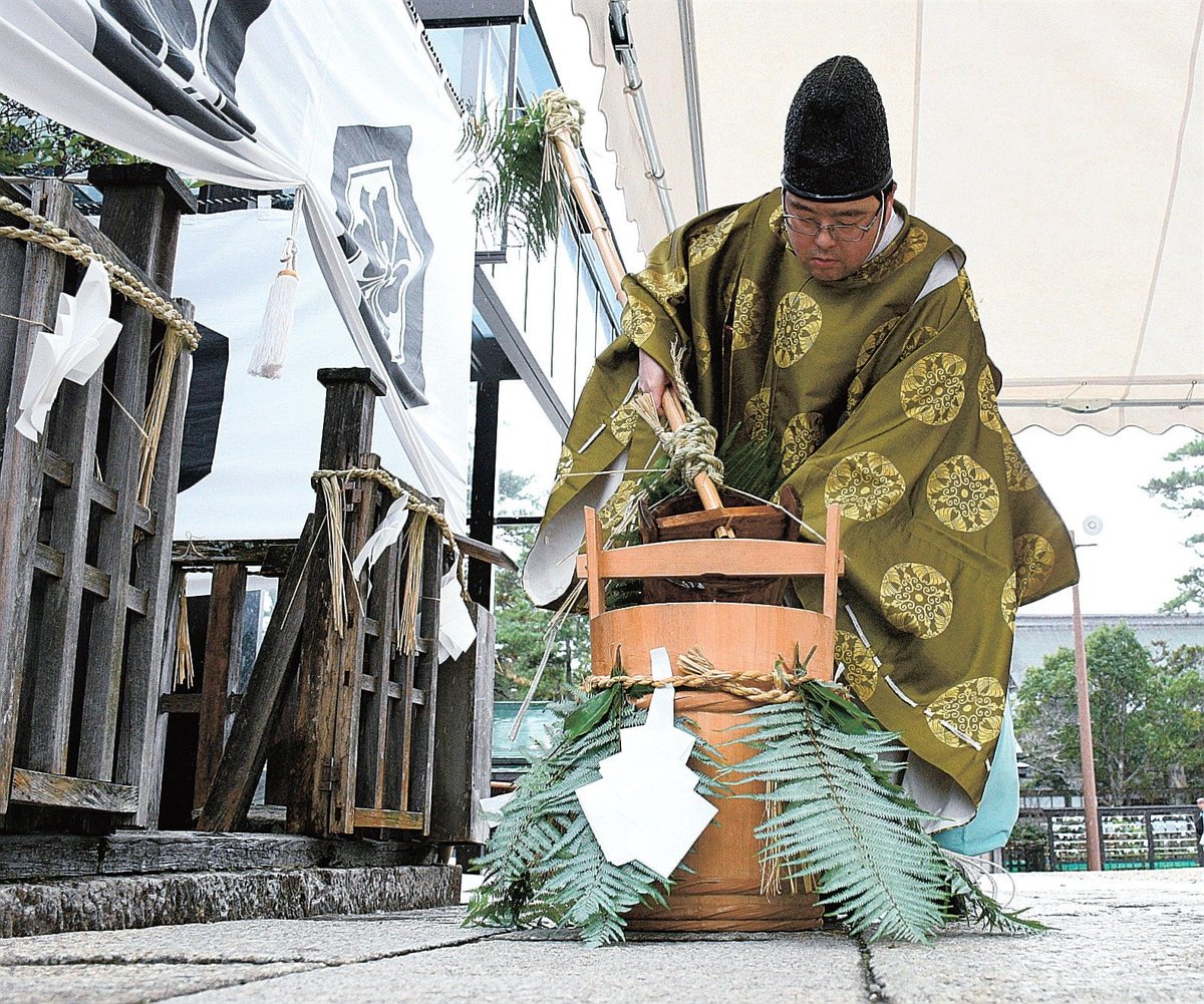 井戸には神紋入りの幕が張られ、米粉を水で練ったしとぎ団子とお神酒が供えられた。千家隆比古(ながひこ)権宮司が祝詞を上げ、琴板を打つ音と神歌に合わせ、両手に持った手草を回す神舞を奉納。神職が井戸からひしゃくで水をくみ、おけに移した。