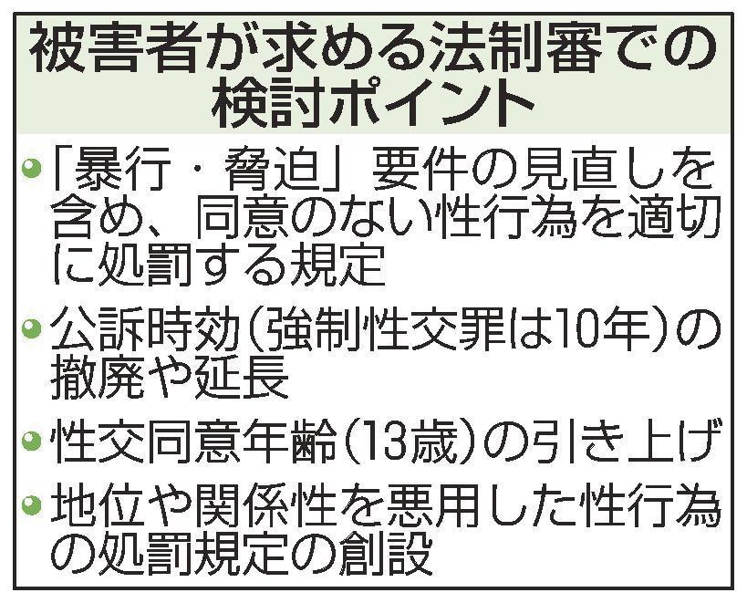 被害者側が特に強調するのは暴行や脅迫があったと立証できないと罪に問えない「暴行・脅迫要件」の見直しだ。性暴力被害者らの団体「Spring」による約6千件の実態調査でも「体が動かなかった」「何が起きているか分からなかった」など、暴行や脅迫がなくても被害に遭ったとの回答が多数あった。