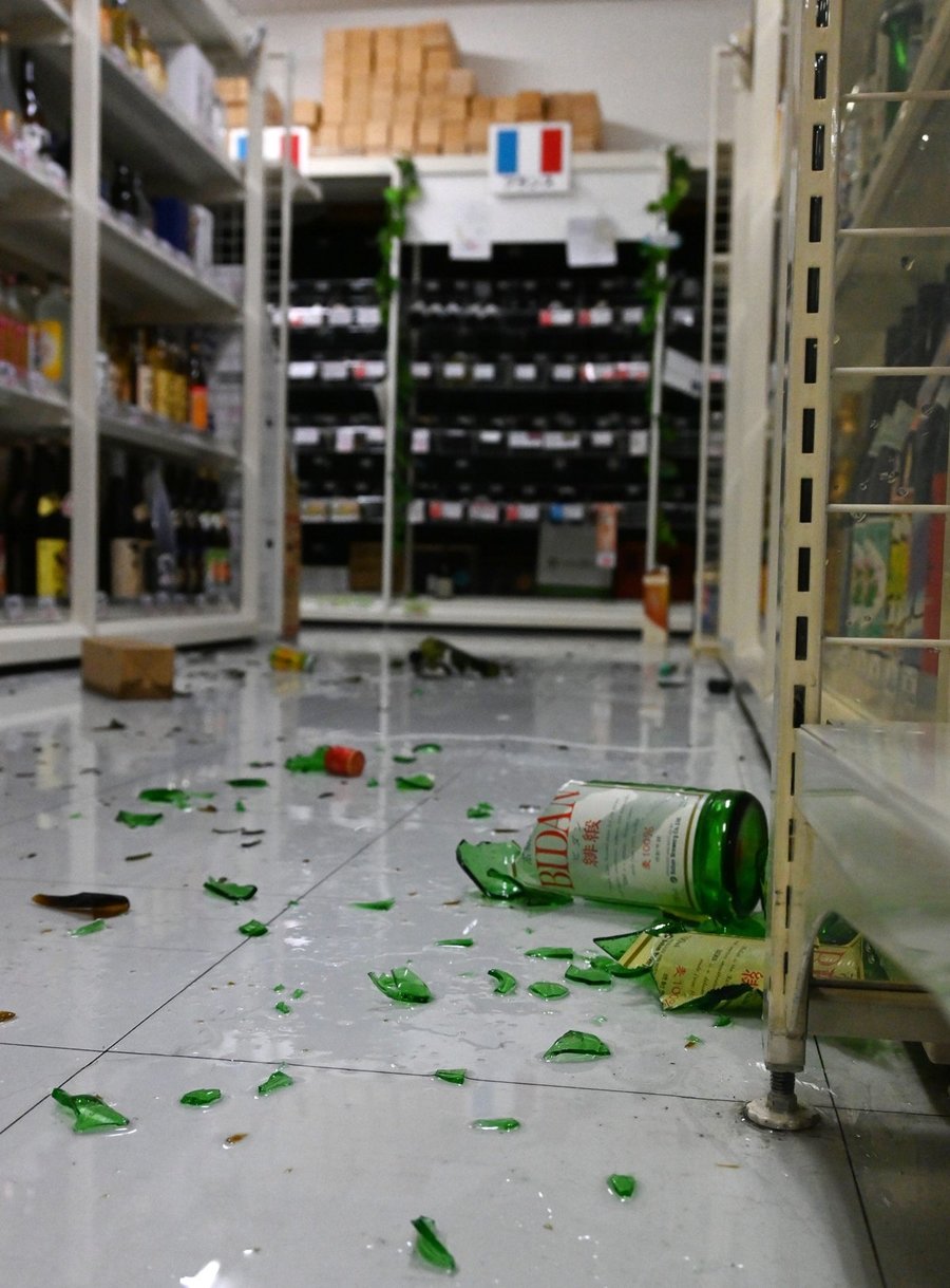 瓶や陶器などを扱う店舗の従業員らは、割れた商品の片付けに追われた。松江市学園1丁目の酒ゴリラ松江学園店では、複数の商品が割れ、床に瓶の破片が散乱。店内にはアルコールのにおいが充満した。福村仁志店長(61)は「強い揺れだったので慌てて店に帰ってきた。従業員が無事でよかった」と胸をなで下ろした。